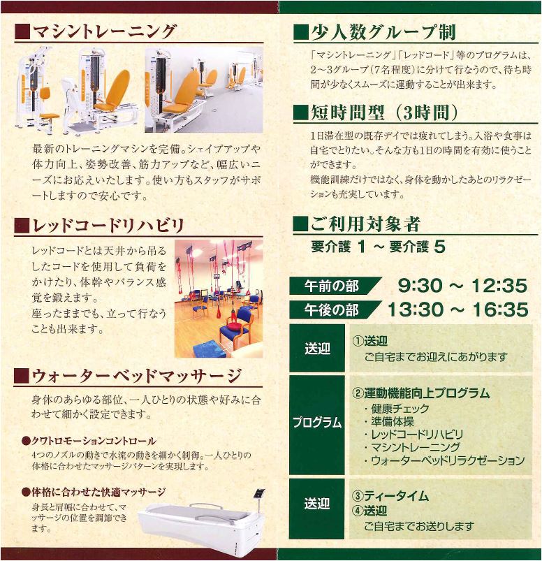 最新鋭の設備と個々に合わせた運動プログラムで、楽しくトレーニング。 介護ではなく「動ける体」を維持したい、取り戻したい方のための施設です。 9:00~18:00. 定休日, 土・日. 住所, 東京都新宿区百人町3-16-6. 対象者, 要支援1・2 要介護1~5 程度の方 ... |